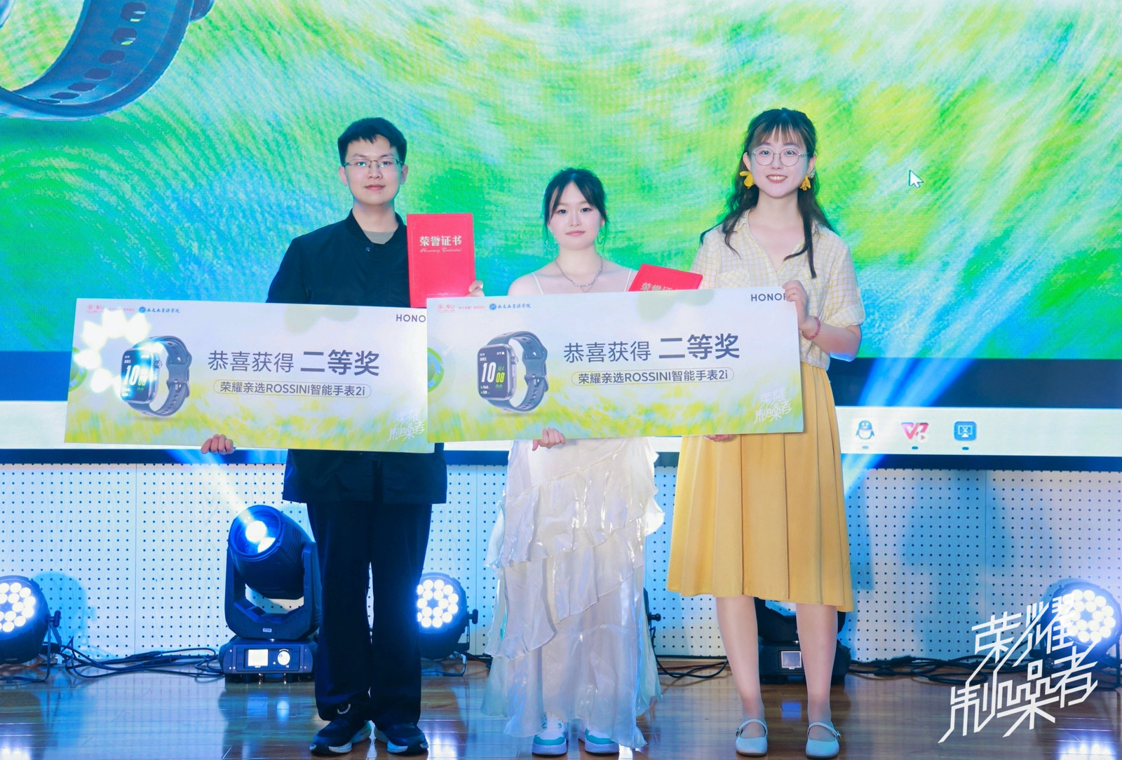 综合评委打分与观众投票,卜王超同学凭借出色表现脱颖而出,荣膺桂冠,赢取了荣耀官方准备的荣耀手表Fit;荣获二等奖的于学锦和刘雅芳同学获得了荣耀亲选ROSSINI智能手表2i;获得三等奖的单海轩、伍垣亦和陈晓雨则喜获荣耀出行礼包。抽奖环节贯穿全场,60名幸运观众获得了荣耀准备的咖啡杯、雨伞等丰厚奖品。